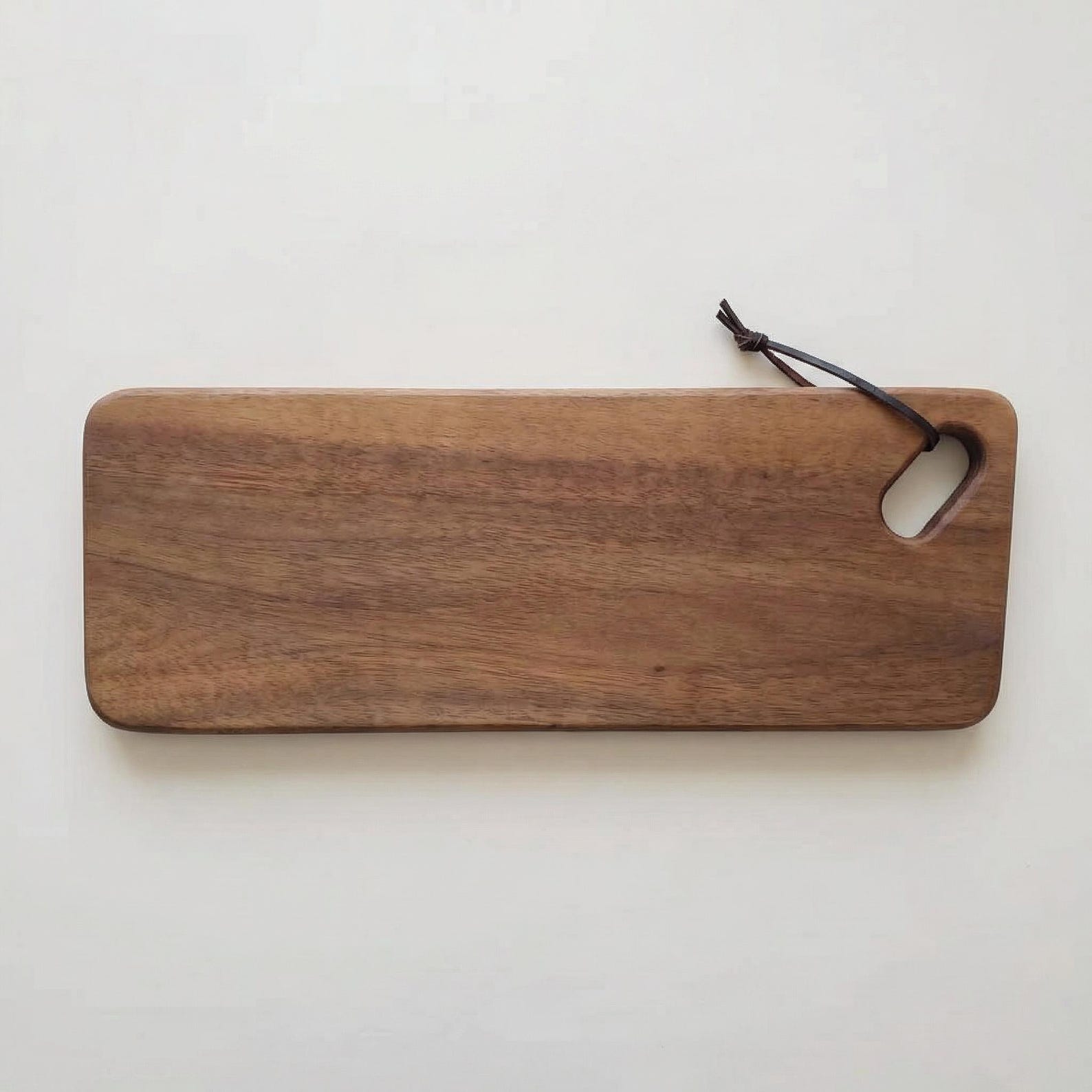 Set of three acacia wood cutting boards with handles, available in graduated sizes. Suitable for food preparation, serving, and charcuterie presentation. Made from natural acacia hardwood with a food-safe finish. Each board in the set has a smooth hand-finished surface. Natural acacia wood grain and color variation between boards is expected.