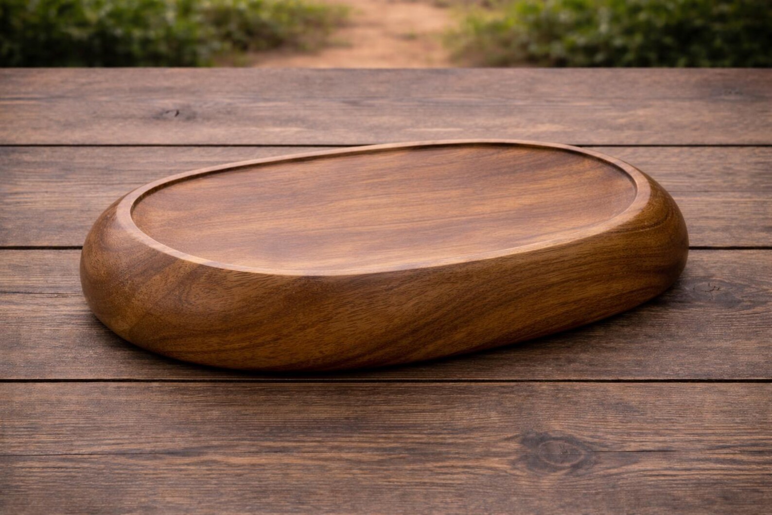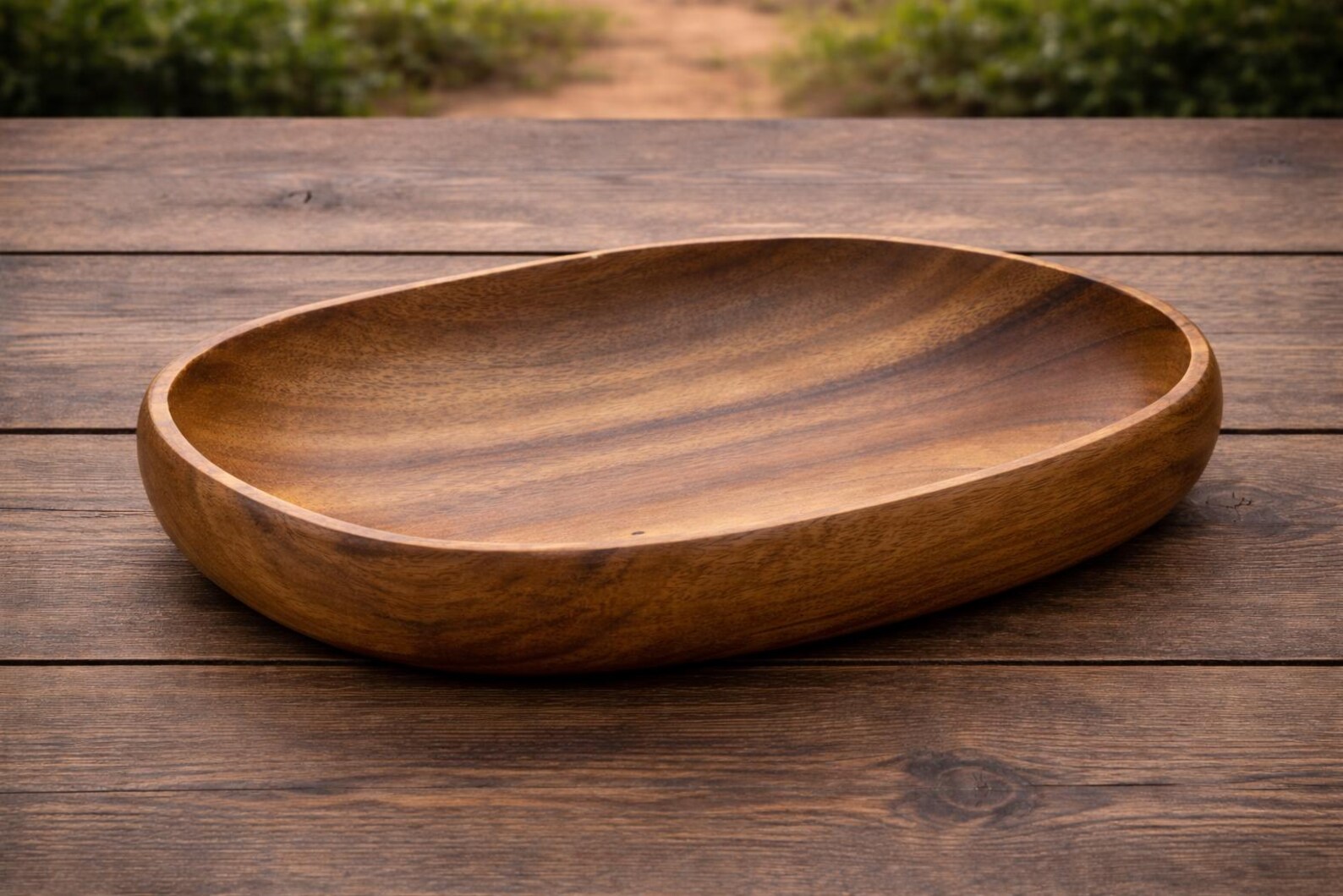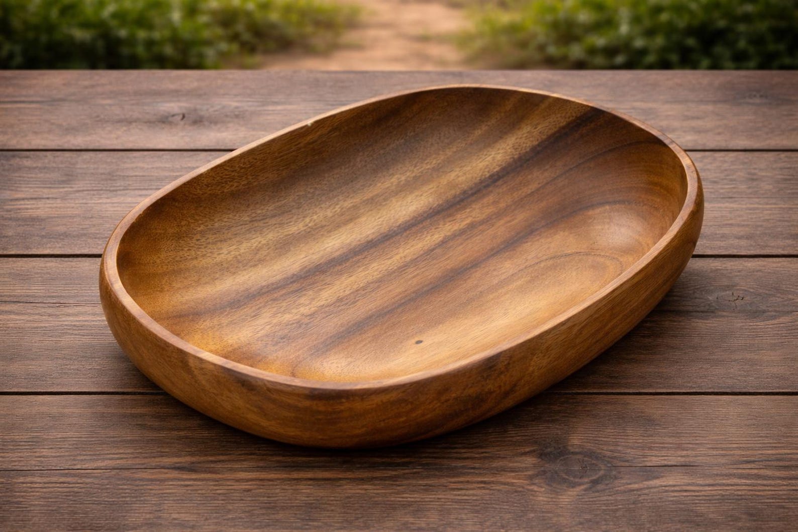 Handcrafted oval serving bowl made from high-quality walnut wood. Smooth polished finish with distinctive natural grain patterns. Suitable for serving fruits, salads, bread, and dry foods. Food-safe natural oil finish. Each bowl is individually crafted — natural variation in walnut wood grain, tone, and shape is expected and reflects the handmade nature of the product.