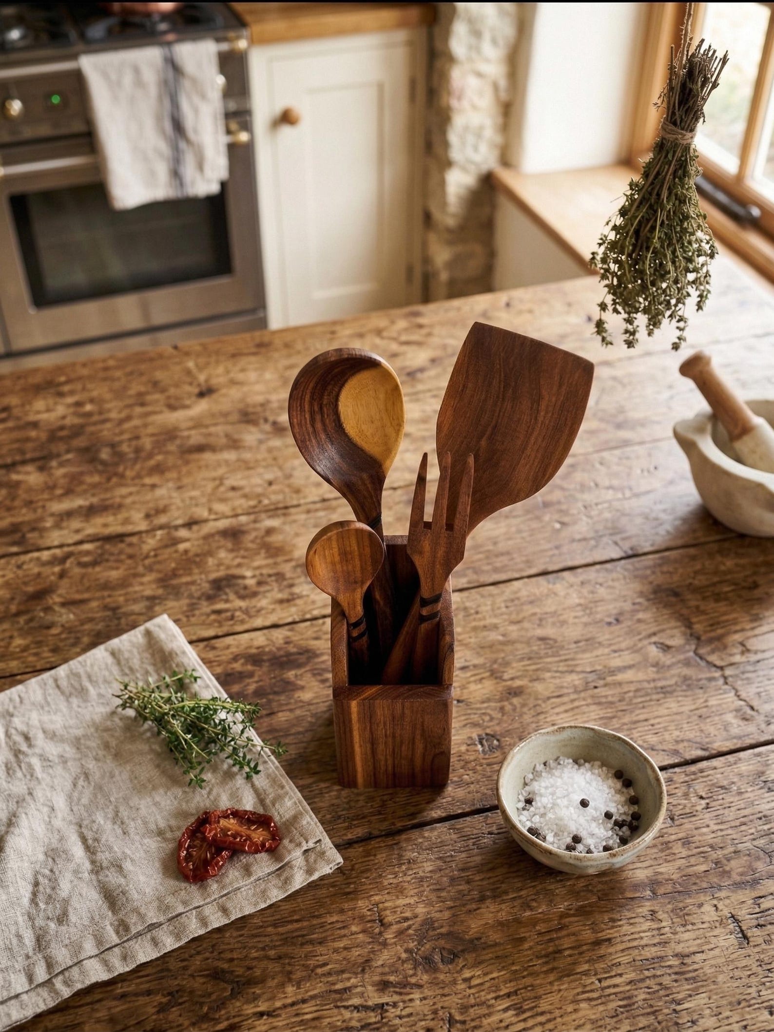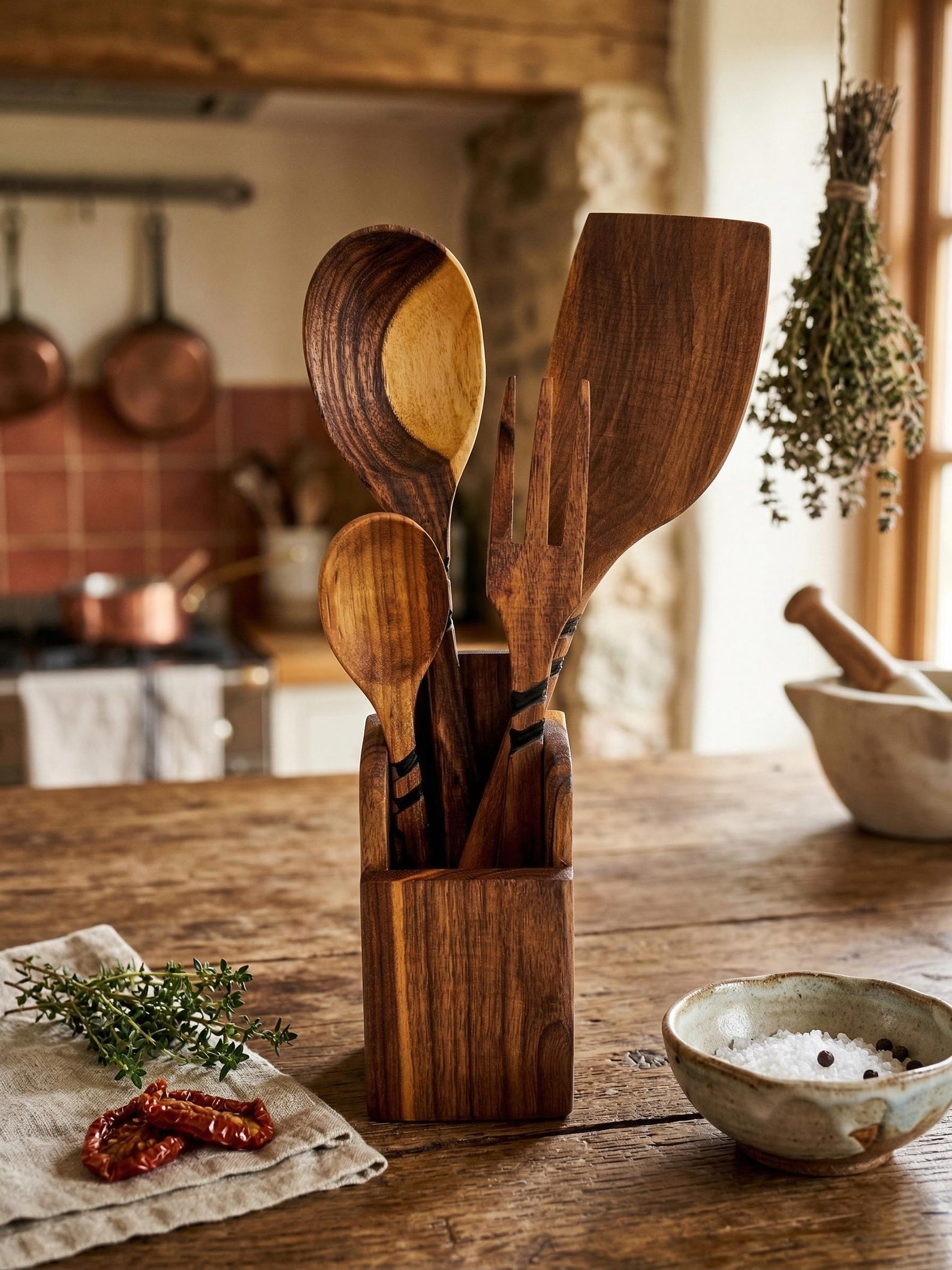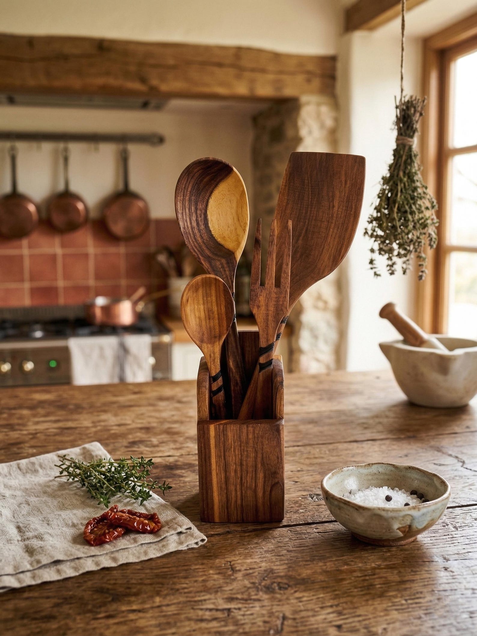 Handmade Walnut Wood Kitchen Utensil Set with Matching Holder – Natural Hardwood Cooking Tools