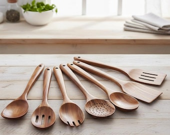 Handmade 7-piece wooden kitchen utensil set crafted from high-quality natural wood. Set includes a rice scoop, salad servers, soup ladle, spatula, and cooking spoon. Each piece is individually shaped and finished by hand. Food-safe natural oil finish. Suitable for all cookware including non-stick pans. Natural wood grain variation between pieces is expected and reflects the handmade nature of the product.