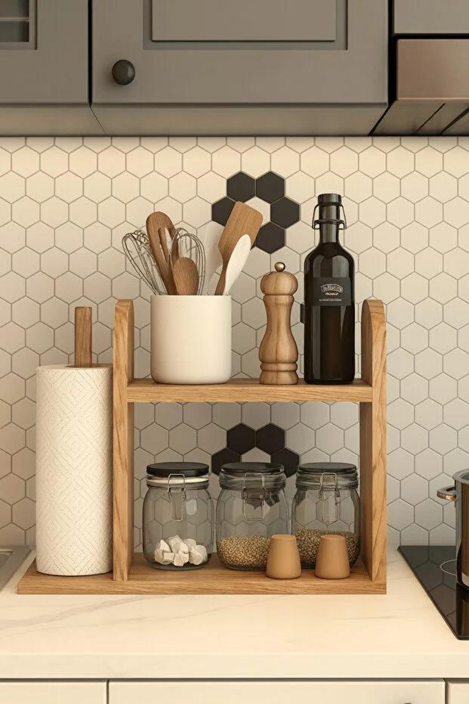 Rustic Wooden Kitchen Organizer – Spice Rack and Paper Towel Holder Shelf