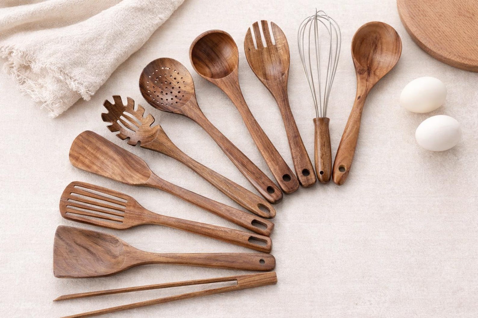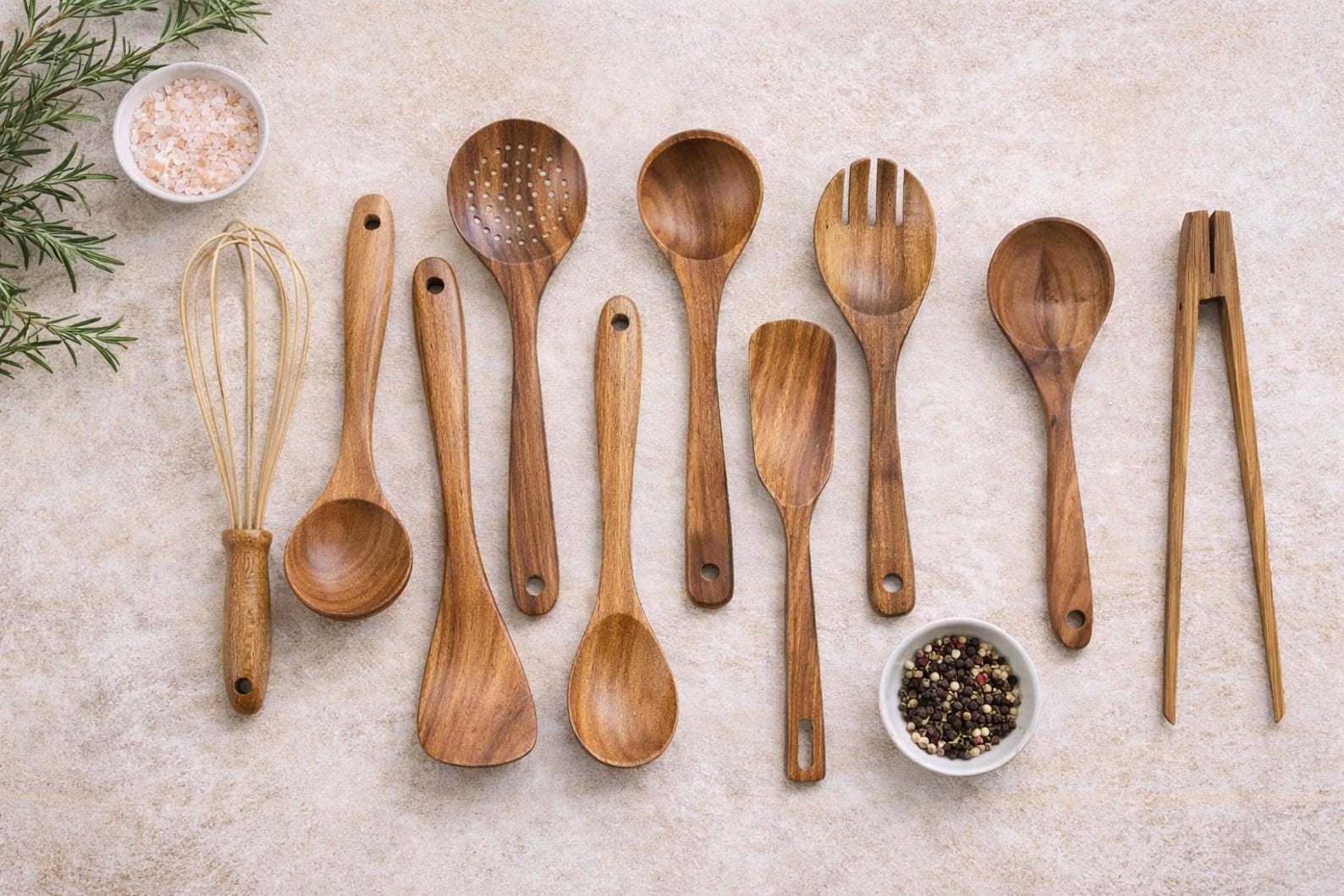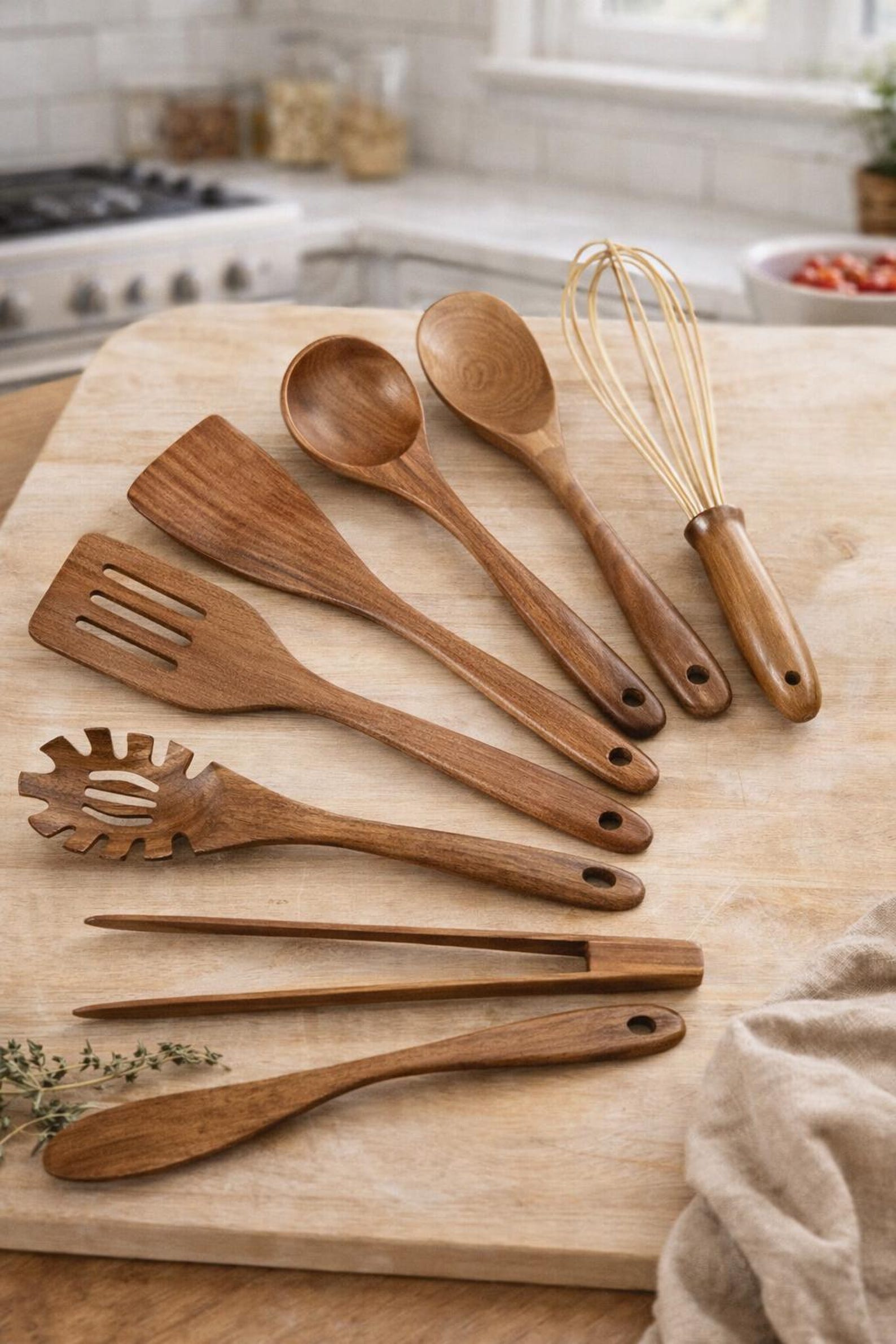 Teak Wood Kitchen Utensil Set – 10 Piece Natural Wood Cooking Tools with Food-Safe Finish